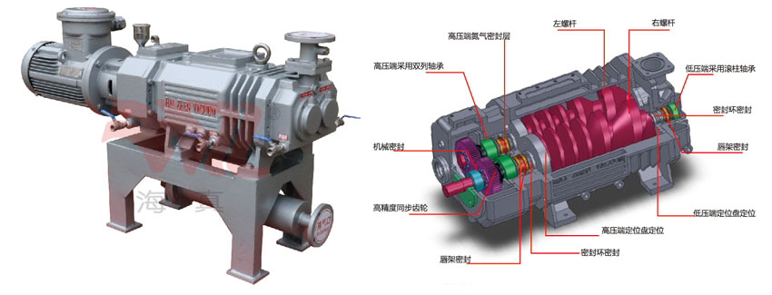變距螺桿式真空泵又稱為干式螺桿真空泵,是利用齒輪傳動同步反向旋轉(zhuǎn)的相互嚙合而不接觸的變距左螺桿與右螺桿作高速轉(zhuǎn)動,利用泵殼和相互嚙合的螺旋將螺旋槽分隔成多個空間、多級壓縮腔體,氣體在不等的各個槽內(nèi)(柱形變螺距)進行傳輸運動。兩螺桿經(jīng)精細動平衡,由軸承支撐,安裝在泵殼中,螺桿與螺桿,螺桿與泵體之間都有一定的間隙,泵工作時相互之間無摩擦,運轉(zhuǎn)平穩(wěn)、噪音低,且工作腔無需潤滑油。完全可以代替油封式機械泵、水封式機械泵成為新一代的主要真空獲得設備。